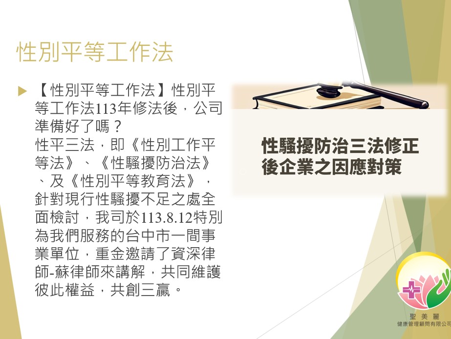 我們以同理心關懷,重視每ㄧ位員工的健康,不只應付冷冰冰的法規,不只北中南的在地化、客製化服務,更多了豐富的人文關懷,我想,這才是員工需要的! 聖美麗承諾「人員專業、品質至上、態度良善」,感動自己,也希望...感動你!